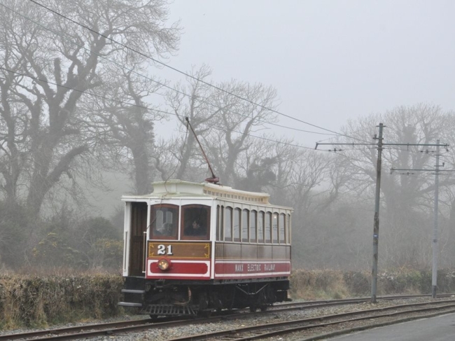 Car No.21 climbs towards Halfway House above Eskadale on the 13th of March 2014, the first day of services for the Manx Electric in 2014. © Andrew Scarffe