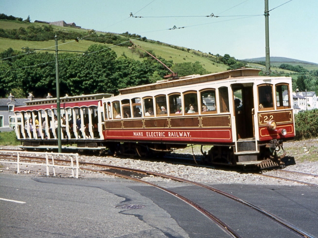 Car No.22 and Trailer No.43 pass over the Laxey No.3 Road Crossing with the 11:00 Derby Castle to Ramsey on the 24th of June 1973. Both car and trailer appear to be well loaded! © Richard Pryke