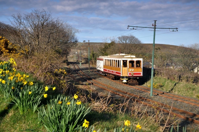 Car No.22 and Trailer No.47 have just passed Burn’s Crossing and approach Dhoon Glen on the 12th of April 2015, working the 17:40 Ramsey to Derby Castle. © Andrew Scarffe