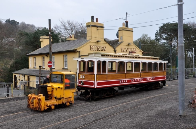 Car No.22 testing the new track layout at Laxey on the morning of the 31st of March 2013. As the overhead wiring was not complete, Car No.22 was towed by the Simplex diesel, 40S280. © Andrew Scarffe