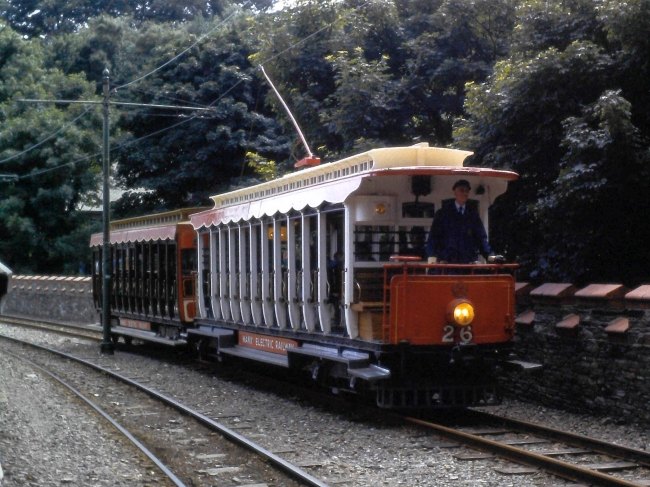 Car No.26 and Trailer No.48 run into Laxey station across the viaduct on the 28th of July 1994, the 100th anniversary of services running to Laxey. © MTMS Images
