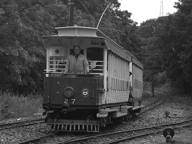 Car No.27 and Trailer No.56 pass Laxey Car Shed with a special for Laxey on the 24th of August 1978. The pair would then reverse formation and shunt onto the Car Shed headshunt. © Colin Clifton