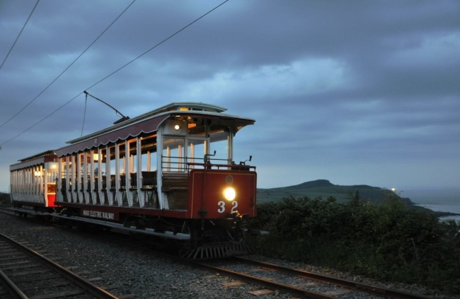 Car No.32 and Trailer No.40 pausing outside Ballajora on the 4th of June 2016, with Maughold Head and Lighthouse the background. © Andrew Scarffe