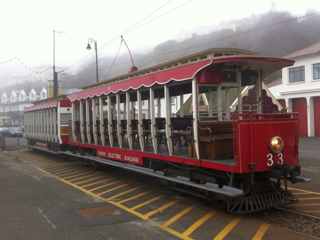 A very misty Derby Castle plays host to Car No.33 and Trailer No.43, waiting to work the 16:10 departure from Derby Castle on the 7th of April 2015. © Alex Fairlie