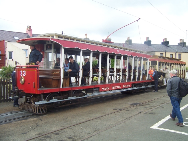 Passengers board Car No.33 and Trailer No.46 on the 1st of August 2010, prior to departure for Derby Castle. The two had previously worked up to Ramsey with Trailer No.51, which was dropped off to allow trips with Locomotive No.34 to The Garey. © David Martin
