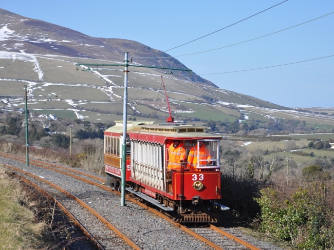Car No.33 and Trailer No.59 approach Brown’s Crossing with with the 15:10 Ramsey-Derby Castle on the 1st of April 2013. © Andrew Scarffe