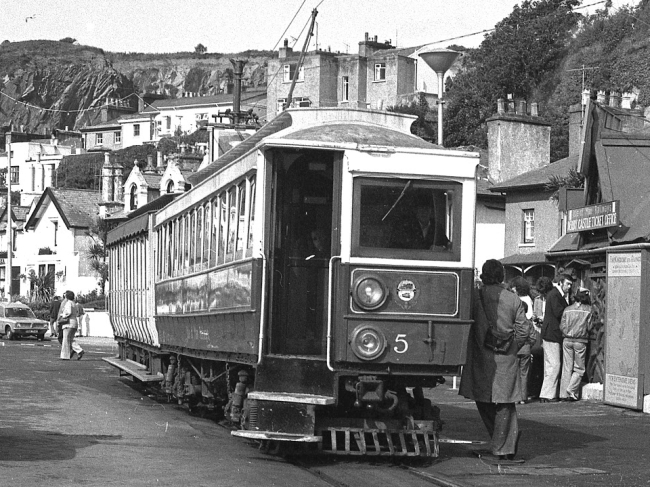 Car No.5 and Trailer No.42 stand at the departure stop at Derby Castle on the 22nd of August 1978. The pair have arrived from the car sheds empty, and all that remains to do is to turn No.5’s trolleypole. No.5 is wearing the ‘Isle of Man Railways’ title and crest, applied the previous Winter. © Colin Clifton