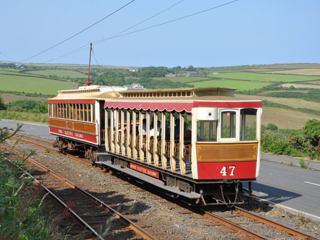 Car No.5 and Trailer No.47 descend from Howstrake towards Groudle on the 8th of July 2013. The pair were working wrong line due to engineering work taking place on the landside line. © Andrew Scarffe
