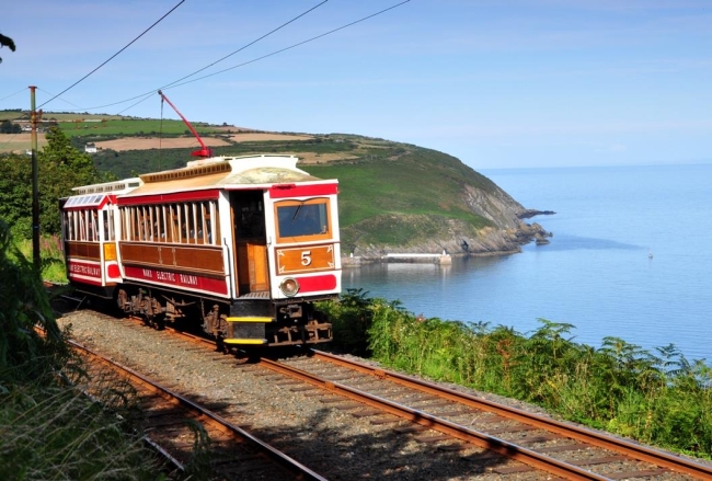 Car No.5 and Trailer No.56 climb up to the halt at Ballabeg with Laxey Harbour in the background, working the 3.10pm ex Ramsey on the 17th of August 2015. © Andrew Scarffe