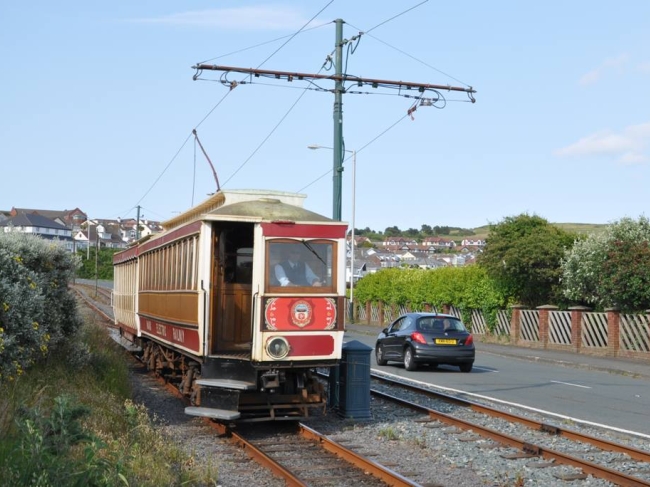 Car No.6 and Trailer No.40 working wrong road at Onchan Head on the 16:10 ex Ramsey on the 26th of June 2013. The seaside overhead wire had been removed from the feeder pole to Port Jack for renewal. Single line working on the landward track was in operation between Derby Castle and Groudle. © Andrew Scarffe