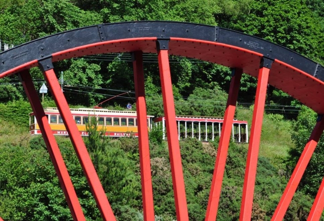 Car No.6, Trailer No.43 and the Lady Evelyn waterwheel on the 28th of June 2014. © Andrew Scarffe