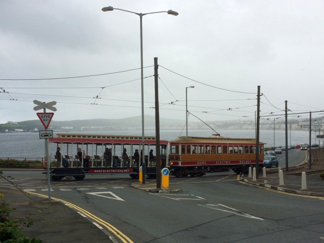 Viewed from Royal Terrace, Car No.6 and Trailer No.43 pass over the road crossing at Port Jack heading for Derby Castle on the 28th of July 2016. © Alex Fairlie