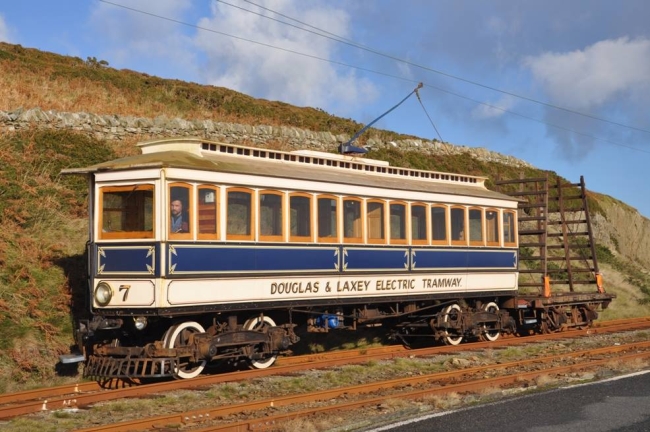 Car No.7 towing Wagon No.1 to Derby Castle Car Sheds on the 4th of November 2013. During the track relays carried out a number of years ago, the elevation of the track had been raised in numerous locations, particularly at Laxey Car Shed. This meant that the top platforms of both tower wagons had to been removed in order to be taken to the yard. The seaside wire has already been removed this morning to allow a track relay to take place so the ensemble had to travel “wrong road” from Groudle. © Andrew Scarffe