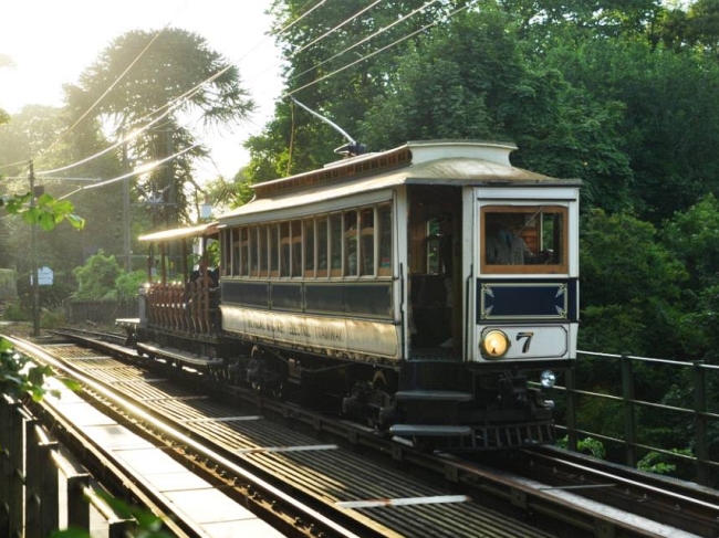 Car No.7, Trailer No.51 and Wagon No.8 pause for a photostop on Ballure Bridge on the 27th of July 2013, working the ‘Terminus Tour’ from Ramsey to Derby Castle. © Andrew Scarffe