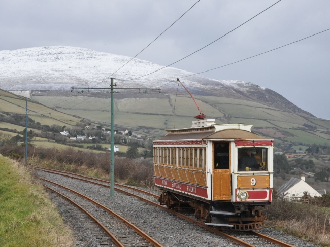 The snowcapped North Barrule provides the backdrop for Car No.9 at Browns Crossing. The Car was working the 11:10 Ramsey to Derby Castle single-motor, on the 10th of March 2013. © Andrew Scarffe
