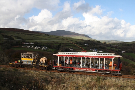 A panoramic photo of the works car pairing at Bulgham Head, with the North Barrule in the background. © Ian Mylroi