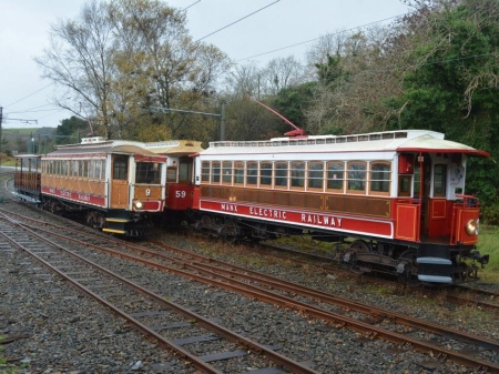 Car No.9 and Trailer No.51, operating the 10:40 Derby Castle-Ramsey, pass ‘Car No.3’ and Trailer No.59, stabled in the Dhoon Quarry Siding. © David Kelly