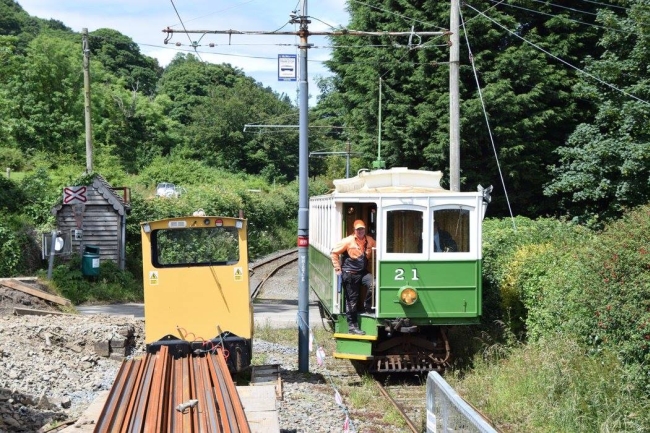 Car No.21 passes LM344 ‘Pig’ and wagon on the approach to the other set at Lewaigue. © Andrew Scarffe