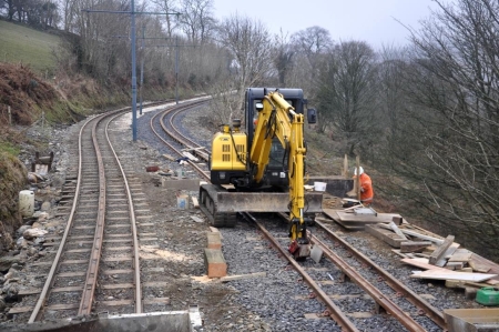 Contractors digger on one of the work sites. In little more than three weeks, the trenches caused by water scour have been filled and the other debris and ballast which was heaped across the tracks has been cleared. © Andrew Scarffe