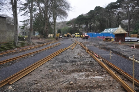 Work has begun on the creation of the track bed for the Snaefell line and also part of the landside MER line. Lengths of the new grooved rail have been placed in their approximate positions.