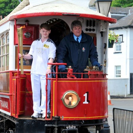 Cai Benyon and the Olympic Torch aboard 1893-built Car No.1 at Derby Castle © David Lloyd-Jones.