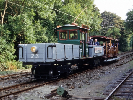 On the 5th of September 1993 Locomotive No.23 was used for a private hire/press trip for the Isle of Man Railways and Tramways Preservation Society (then the Isle of Man Railway Society) between Derby Castle and Laxey, hauling Trailer No.51, here passing Laxey Car Shed. © http://www.mer.im