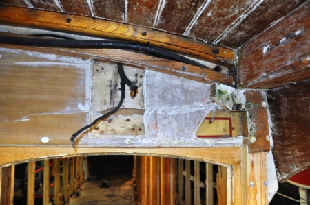 Removal of the wooden supports for the light switch and bell mounting revealed this superbly preserved example of the original 1898 paintwork and lining. Note also that the main cable from the circuit breaker to the controller has been revealed by removing the top cover. The cable continued behind a wooden cover on the bulkhead upright. © Andrew Scarffe