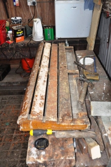 The Douglas end platform seat has now been removed and is being stripped and cleaned prior to varnishing. © Andrew Scarffe