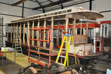Car 14 following the removal of the landside eavesboard. Although there are a few cracks and holes in the boards, they will be repaired and refitted. © Andrew Scarffe