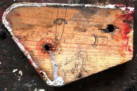 A puzzle…… When Cars 14 to 18 were delivered, at the conductors position on the rear platform, the internal bell was on the left of the bulkhead and the bell lever was on the right of the bulkhead. Within a few years the positions were swapped over, presumably so that the conductor had a better view when giving the motorman “two bells” to start away. The re-positioning of the bell required a new wooden mount; this has been removed from the Douglas end of Car 14 to clean etc. On the reverse of the wooden mounting are these intriguing pencil marks. At the bottom is the name H Lawton and the date 15th Jan 1908. There are also three small drawings, the uppermost of which appears to be a drawing of a tram. There is a bogie, sides, window, clerestory roof, trolley and trolley rope! Is this also the work of Mr Lawton? Did Mr Lawton move the position of the bells in January 1908? © Andrew Scarffe