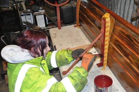 We are still working on Car 14’s seats! This is the metalwork of the Douglas end inside bulkhead seat being treated to a coat of maroon paint. © Andrew Scarffe