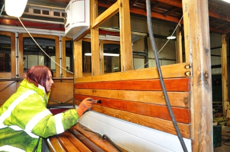 Busy day for the team on Car 14 today. Varnishing the Douglas end seat back. © Andrew Scarffe