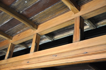Part of the interior of the wooden frame of the clestory roof as removal of the old varnish continues. © Andrew Scarffe