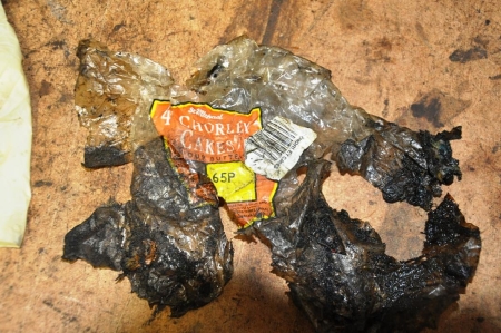 Found inside the motor casing, wrapper for Marks and Spencer – St Michael brand – four Chorley Cakes for 65p! © Andrew Scarffe