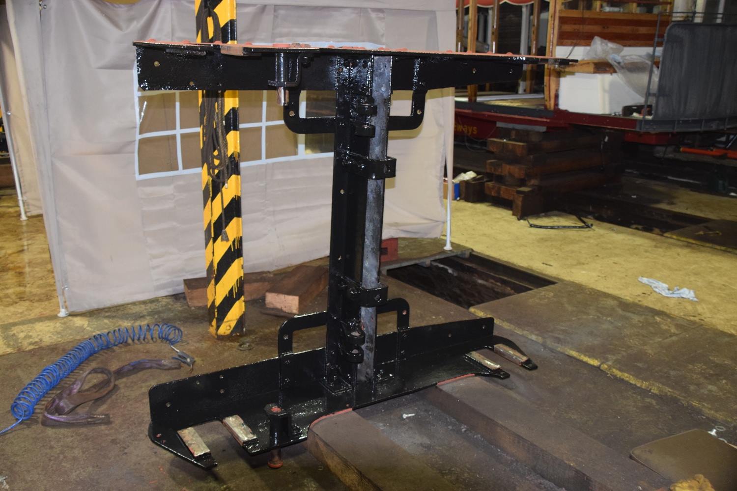 One of the plate frame bogies from Car No.14 lies on its side so that the horn guides and brake mountings can be repaired on the 21st of November. © Andrew Scarffe