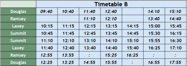 Note: Connecting Service departure and arrival times from/to Douglas and Ramsey are shown for each service where applicable in italics, changing at Laxey.