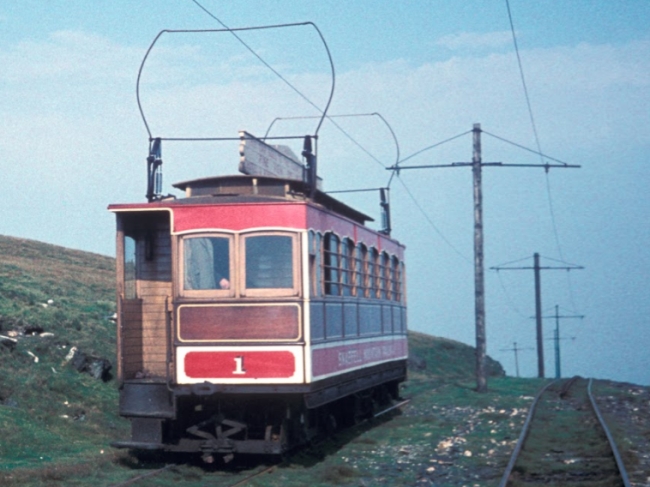 Snaefell No.1 arrives at the summit with a working from Laxey on a sunny 29th of August 1961. © Neil Clifton