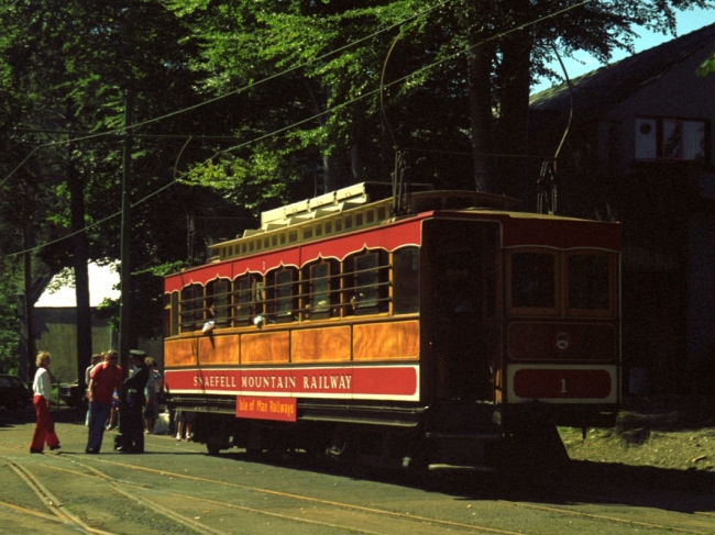 Snaefell No.1 waits to depart with a full load for the summit on the 20th of August 1978. At the time the car was carrying the small ‘Isle of Man Railways’ additional signboards. © Colin Clifton
