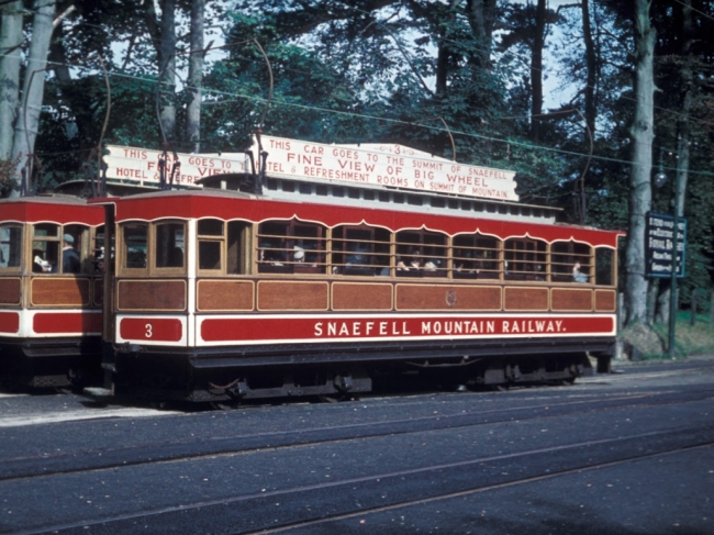 Snaefell No.3 waits to depart with another load of passengers to the summit on the 29th of August 1961, in the company of Snaefell No.6 alongside. © Neil Clifton