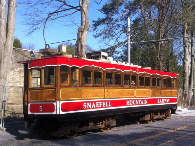 Snaefell No.5 stands in Laxey Station on the 7th of April 2015. The car had just returned from a repaint, which saw the reinstatement of the ‘Snaefell Mountain Railway’ title. © Alex Fairlie