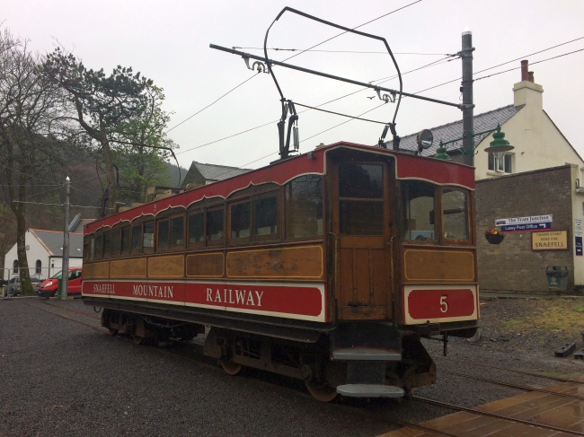 Snaefell No.5 stands at Laxey Station on the 17th of April 2017, awaiting departure for Bungalow and the Summit. © Alex Fairlie