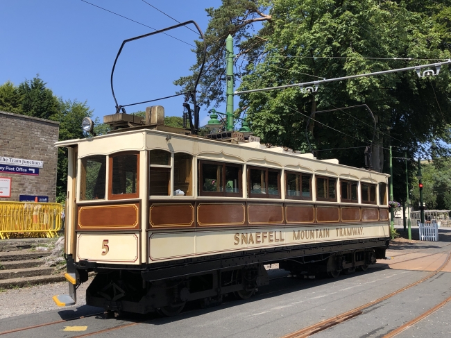 Snaefell No.5 was repainted into the original 1895 livery of Teak and Ivory during 2020. Here the car stands at the Laxey terminus on the 18th of July 2021. © Alex Fairlie