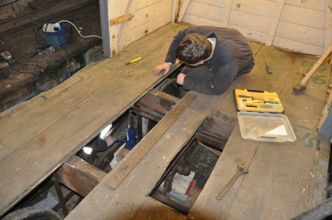 In order to gain greater access to the chassis of the van, the floorboards will be removed. Two planks have already been taken off but large bolts through the floor and timber frame caused a few problems. © Andrew Scarffe