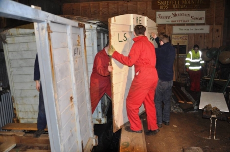 Each end was fixed in place with one bar fixed between the corner uprights and by nailing the ends of the planks directly into the uprights. This is the Ramsey end being removed in one piece. © Andrew Scarffe