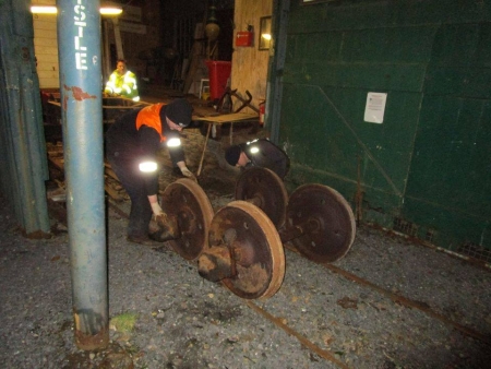 The wheels were then pushed outside the goods shed to allow the frame to be lowered down onto support blocks. Mail van 11 now consists of a kit of components which can be more readily restored. © Andrew Scarffe